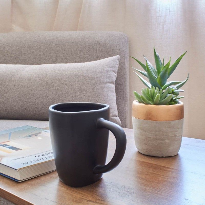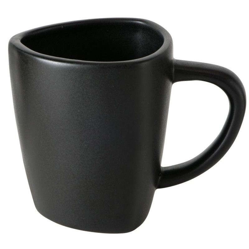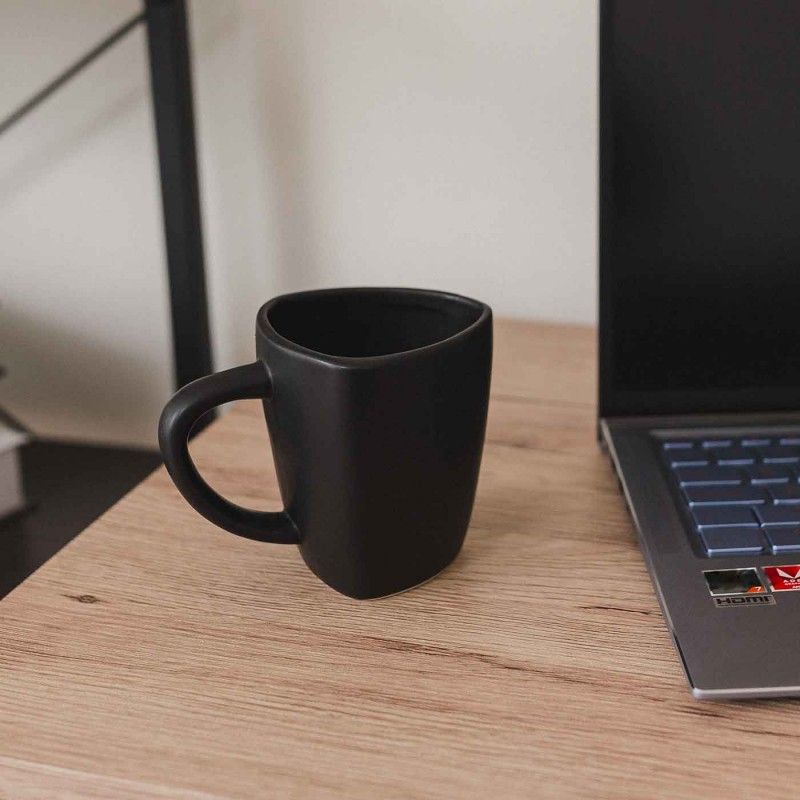 Taza fabricada en cerámica de color negro en forma de triángulo. Un diseño original y minimalista para una taza muy especial. ideal para un estilo industrial y retro. ¡Te encantará!